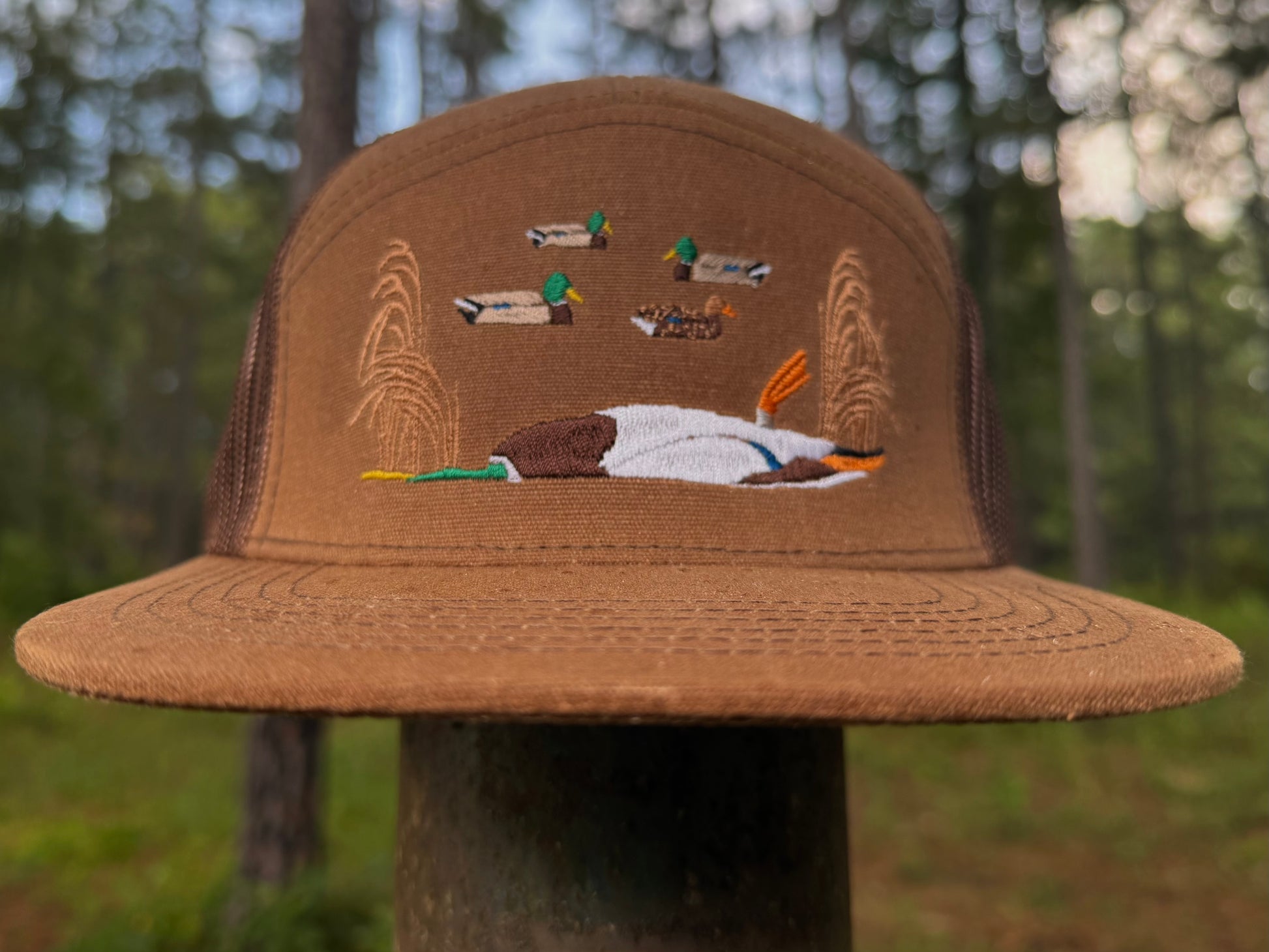 This hat was inspired by a duck hunt where we filled a 4 man limit of mallards along with one banded mallard. This was the first banded bird killed on this particular farm in 20 years.